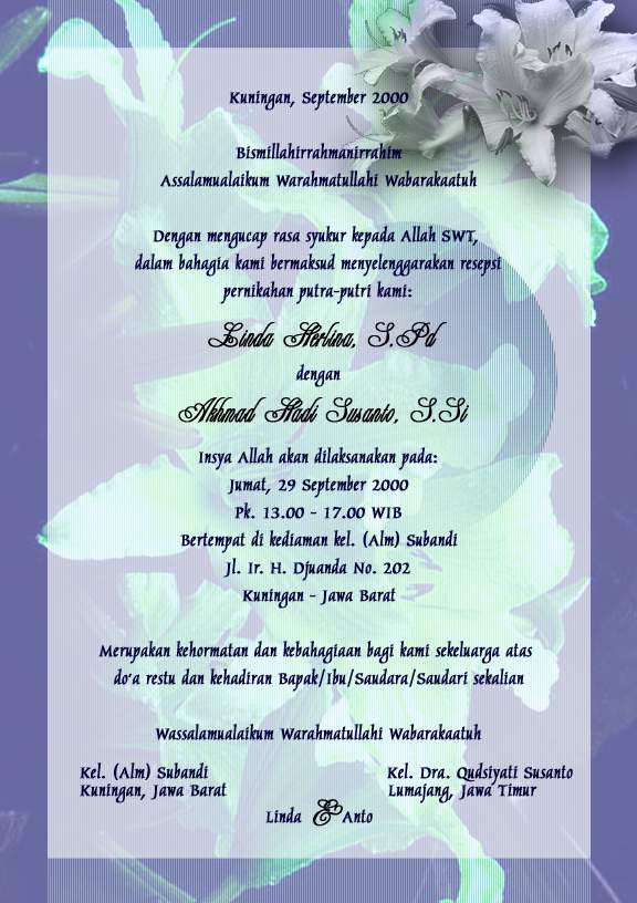 -------------------------- eGroups Sponsor -------------------------~-~> GET A NEXTCARD VISA, in 30 seconds! Get rates as low as 0.0% Intro or 9.99% Ongoing APR and no annual fee! Apply NOW! http://click.egroups.com/1/9331/5/_/48885/_/969591295/ ---------------------------------------------------------------------_-> Buat teman-teman, mohon do'a restunya. Kalau ada kesempatan, silakan datang... (sorry aku attach ke JPG, semoga punya viewernya). (See attached file: und(lind-ahs).jpg) Akad nikah: Kuningan, 29 Sept. 2000 08.00 WIB Piksi-L merupakan mailing-list alumni asisten Piksi. Opini yang disampaikan di forum ini *sama sekali* tidak berkaitan dengan kelembagaan Piksi secara formal. Berhenti: piksi-l-unsubscribe @ somewhere.in.the.world